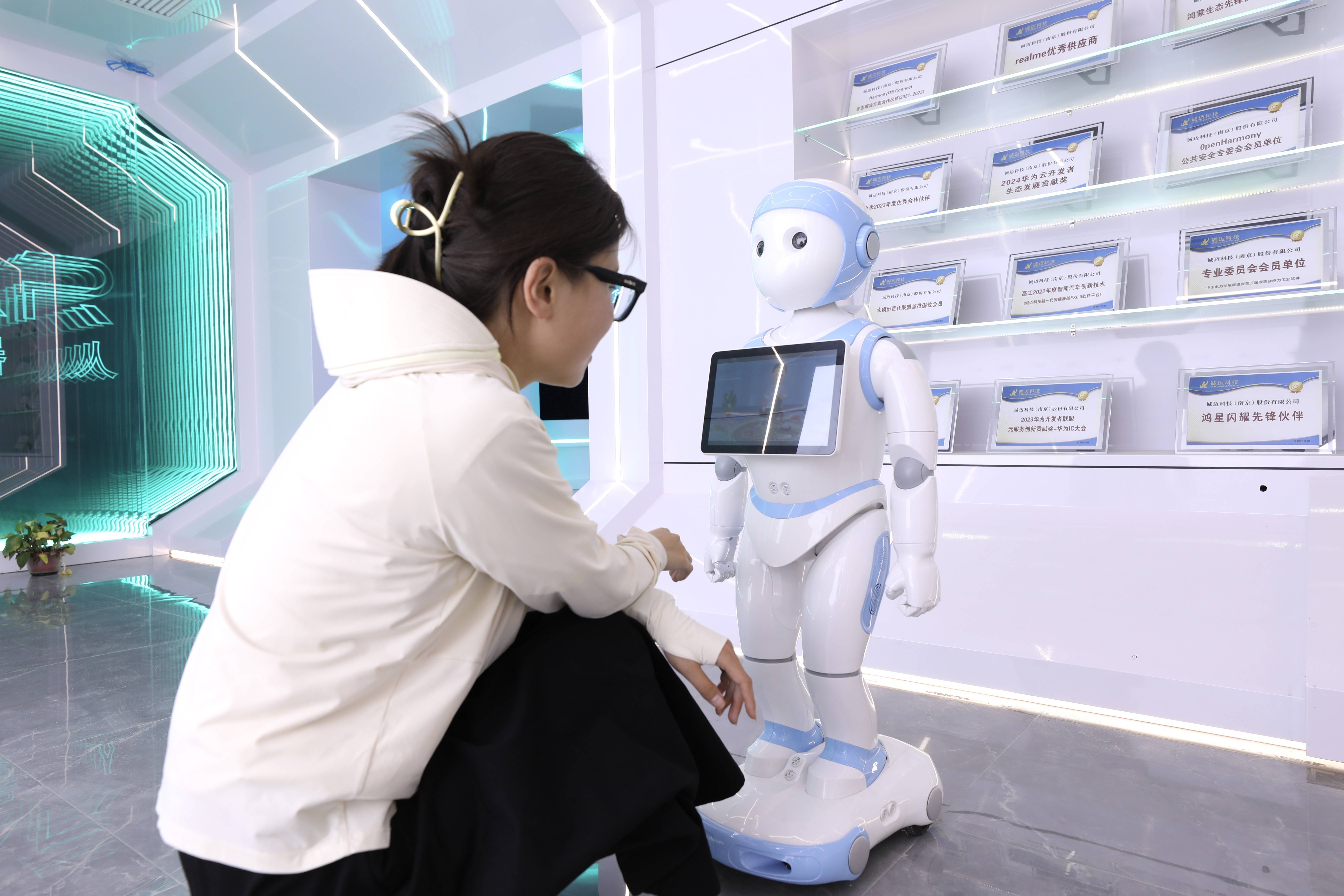 呼和浩特市和林格尔新区人工智能体验馆里,一名工作人员在与一款人工智能机器人进行互动。新华社发(刘慧 摄)在“中国乳都”呼和浩特市,不少大型牧场已实现智改数转,生产效率显著提升。“现在应用‘星辰大模型’,借助图像几秒就能精准‘算’出奶牛头数,掰指头数牛正在成为过去时。”中国电信呼和浩特分公司副总经理王宝云说。